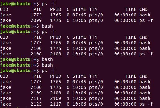 세 번째 쉘의 PPID는 2100이며, 이는 두 번째 쉘의 PID와 일치한다.