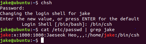 chsh 명령을 통해 bash를 csh로 기본 쉘을 바꾸어 보자.